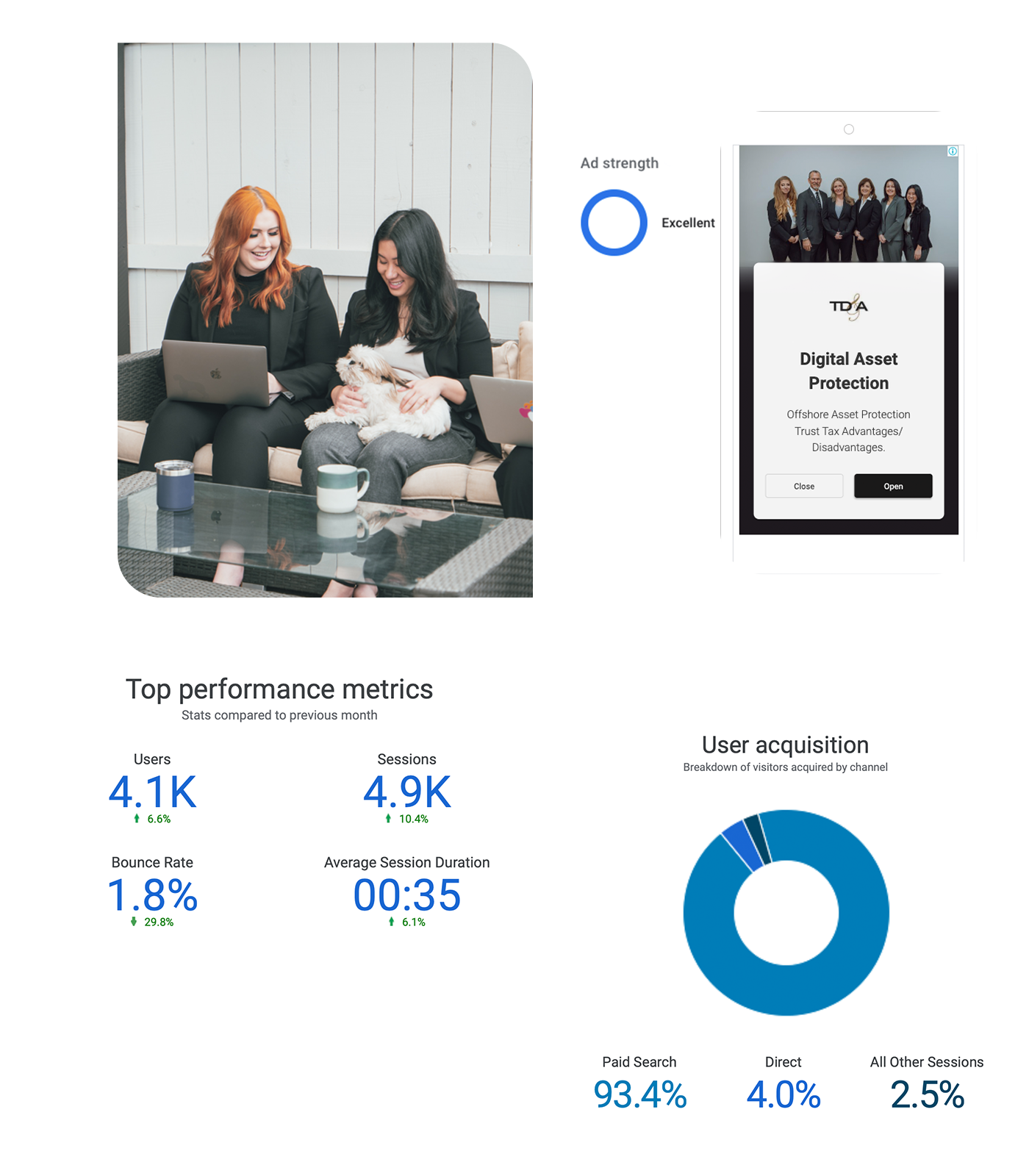 workin closely with the implementation team at Google, I created an ecosystem of paid-ad campaigns that allowed Tresp Law to dominate their respective sectors. In an attempt to hold myself accountable, we held weekly strategy meetings and monthly analytics meetings with Tresp Law where I would walk them through what I was working on, the performance of each campaign, and then we’d discuss their feedback and upcoming goals. The results were similar to what you see above: consistent increases in users and conversions with the addition of lowering cost-per-click and bounce rates.